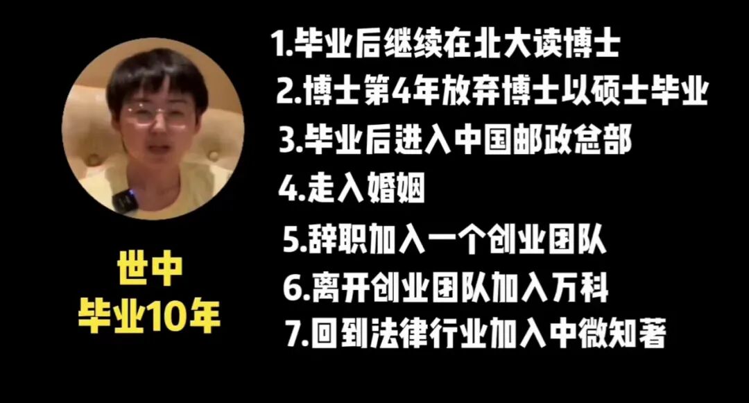 33岁的世中,已婚已育,毕业后继续留在北大读博,之后经历了辞职、创业,现在也是在做法律服务。