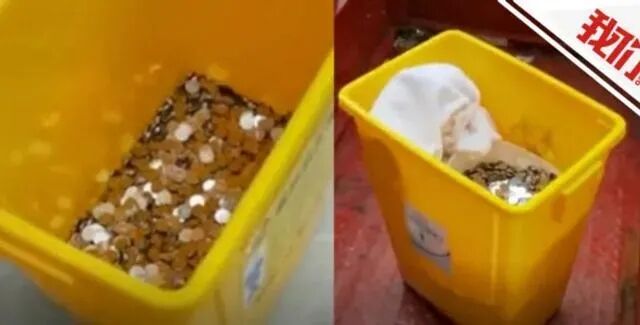 这些硬币被装在2个医疗废物桶里,公司的人还让她赶紧数钱:
