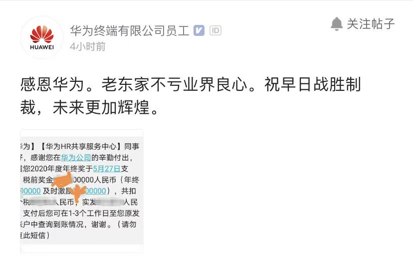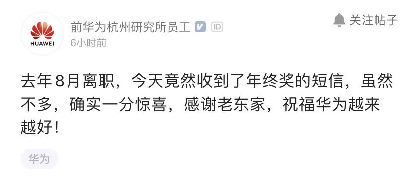 虽然不多,却是一份惊喜。感谢老东家,祝福华为越来越好。”