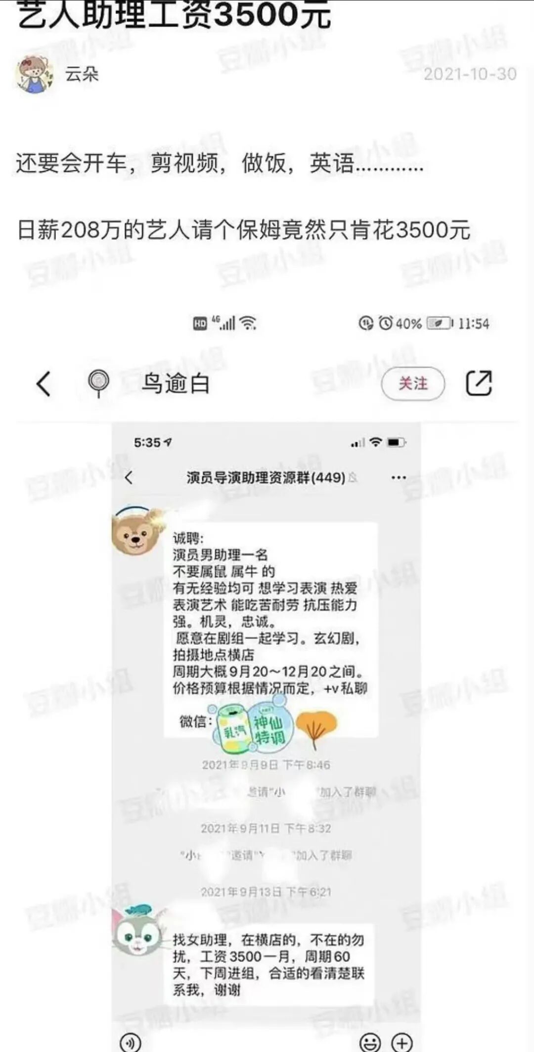 前几天,就有人在网上晒了一张群聊截图,是艺人助理的招聘信息。