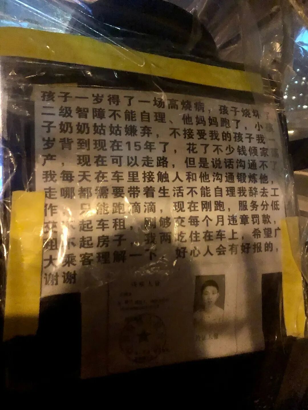 贴在副驾驶座位背后的照片和说明,字字都是心酸,句句都是无奈。