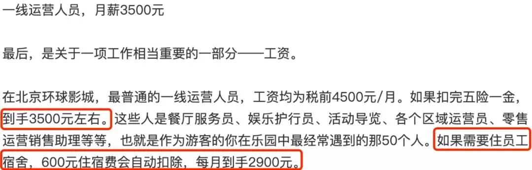 “在北京环球影城,最普通的一线运营人员,工资均为税前4500元每个月。