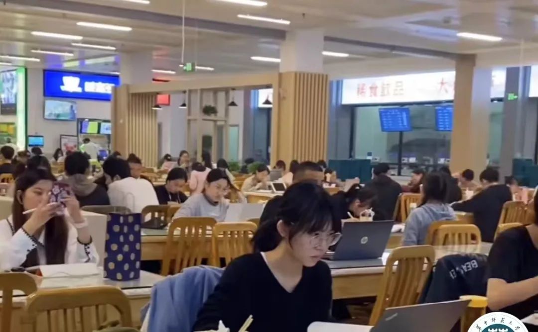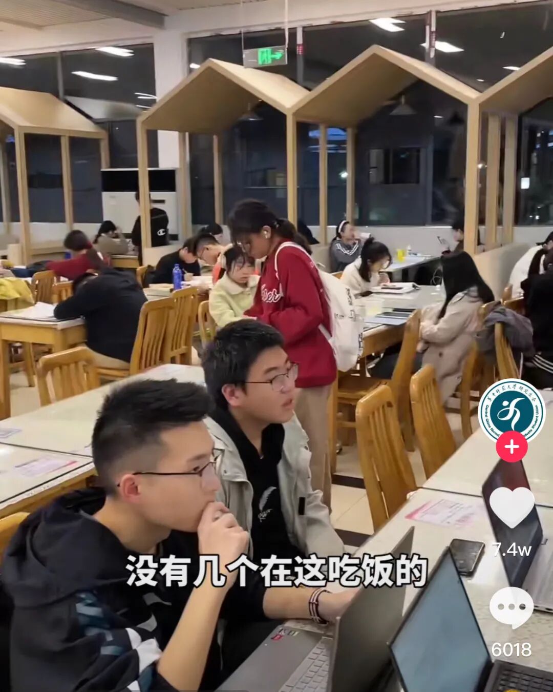 视频拍摄者发出了这样的感慨:卷啊太卷了,食堂都变成了图书馆。