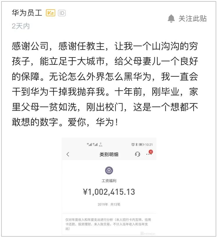 配图是他在华为一年内的工资福利金额,高达100多万,秒杀了多少职场人。