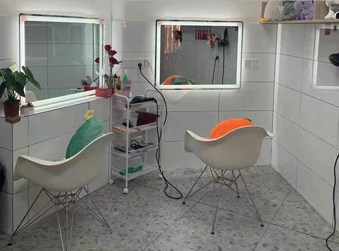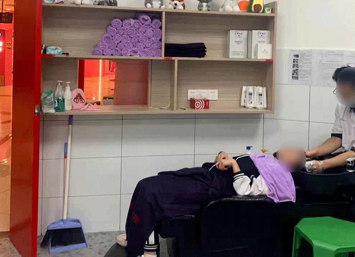 专门隔出来一个小房间,里面有洗头床、镜子、毛巾等,还有专业的理发小哥。