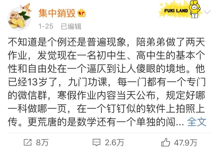 他说,陪弟弟做了两天作业,发觉现在一名初中生、高中生的基本个性和自由处在一个逼仄到让人傻眼的境地: