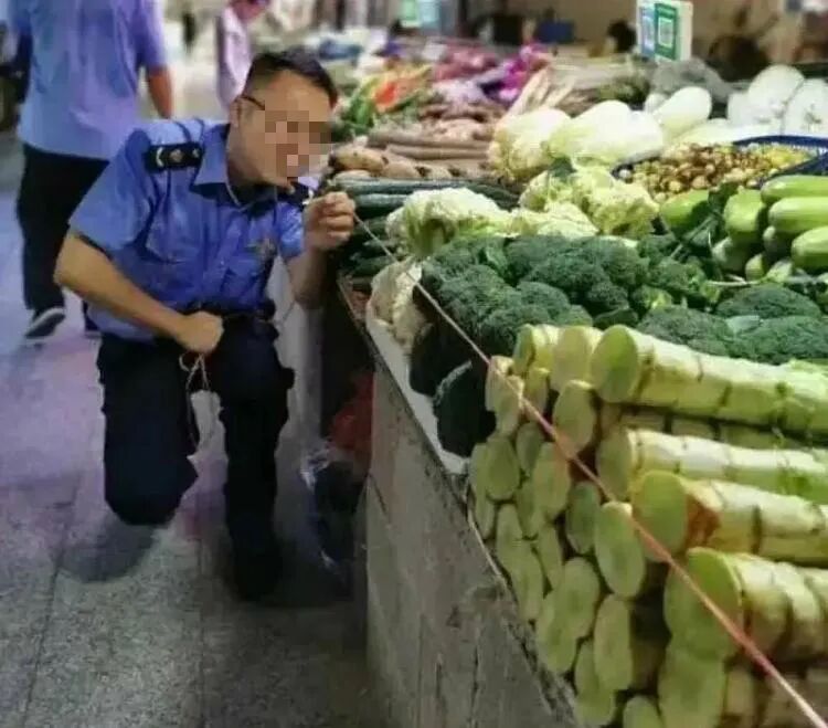 这让我想起了不久前,一张执法人员半蹲在菜摊前,用直线丈量蔬菜的照片。