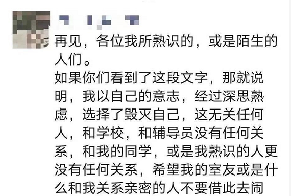 前段时间,北交大一名大三学生,在朋友圈里留下一封遗书之后,跳楼自杀了。
