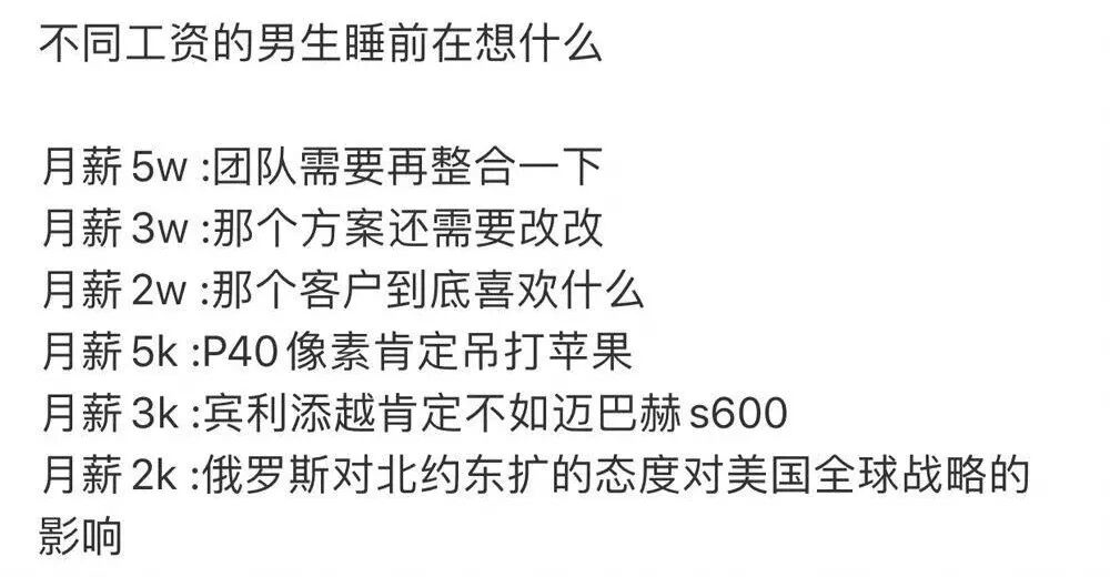 就像网上一个段子:不同工资的男生,睡觉前都在想什么?