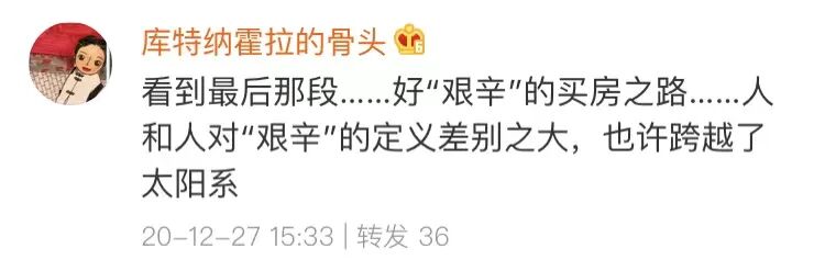 评论区有人说出了我的心声:“看到最后那段说,好艰辛的买房之路。人和人对‘艰辛’的定义差别之大,也许跨越了太阳系。”