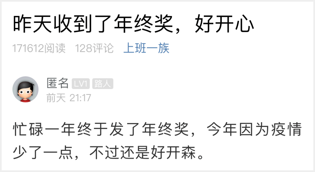 底下的回复令人心酸不已,有惨遭大幅度缩水的,有从来没见过年终奖的,有象征性地发了几张代金券的......