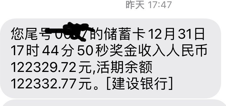 配图是他年终奖到账的银行短信截图,数额竟有122329.72元。