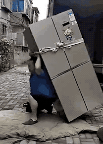 又像这个用弱小身躯扛起冰箱的大叔,为了家庭为了生计,不得不低入尘埃,靠体力谋生;