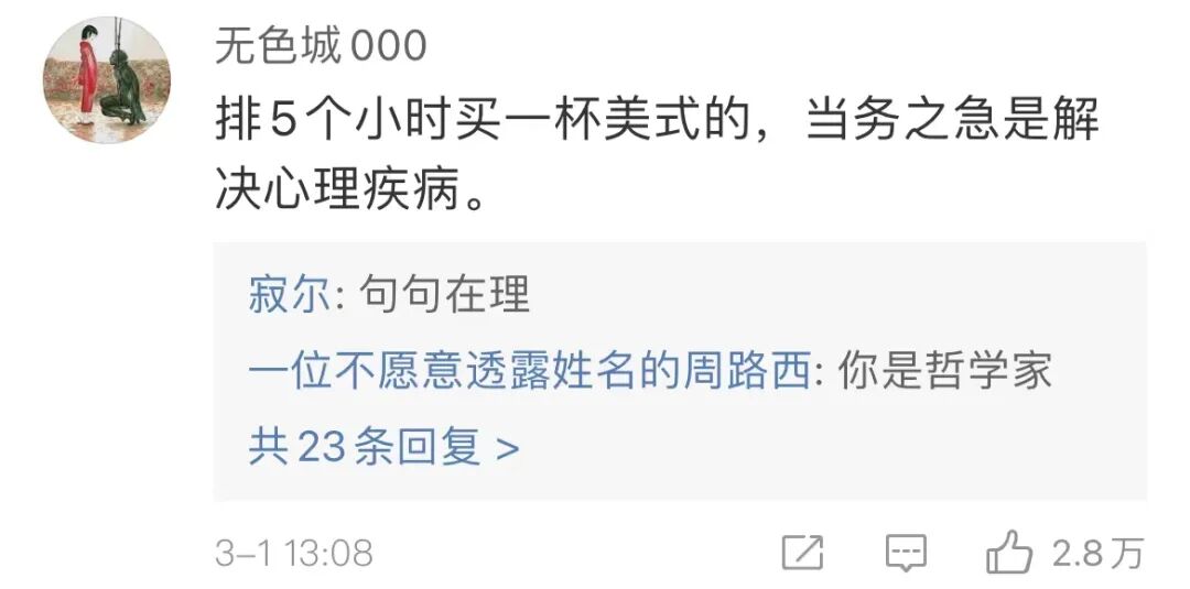 有网友更是精准戳中了问题核心:“排5个小时买一杯美式的,当务之急是解决心理疾病。”