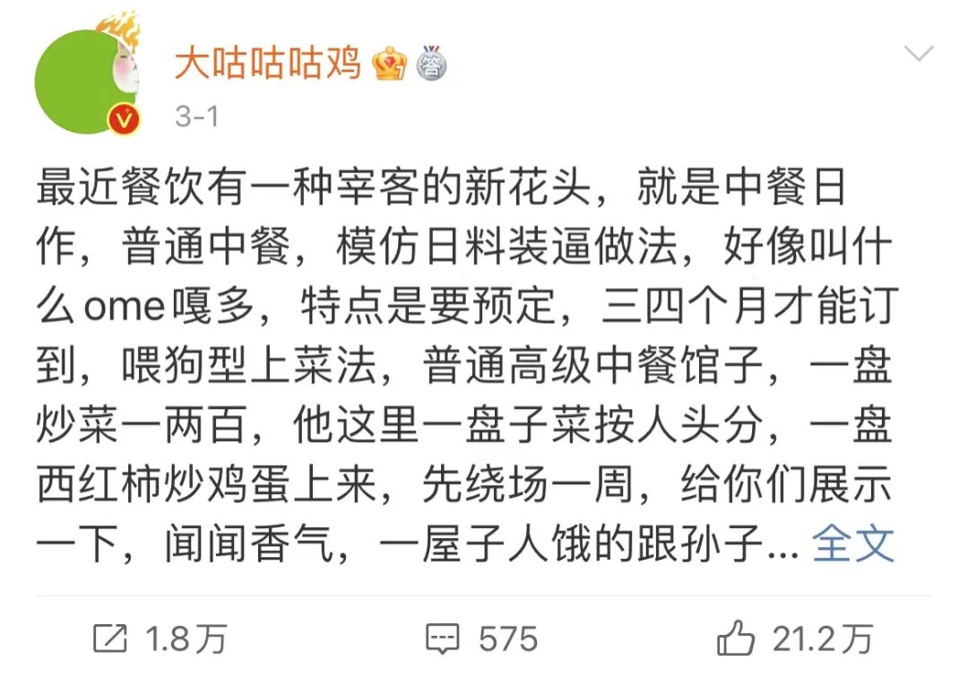 前几天,一位博主“大咕咕咕鸡”吐槽上海某中餐厅的微博,火上了热搜: