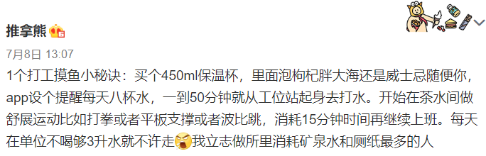 保温杯里泡枸杞胖大海或威士忌,上班满50分钟就去打水;