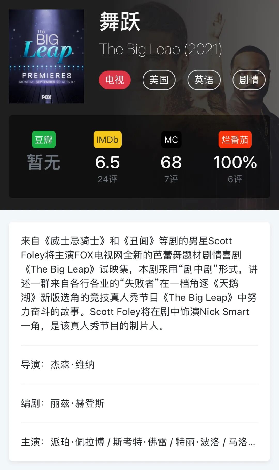 来自《威士忌骑士》和《丑闻》等剧的男星Scott Foley将主演FOX电视网全新的芭蕾舞题材剧情喜剧《The Big Leap》试映集,本剧采用“剧中剧”形式,讲述一群来自各行各业的“失败者”在一档角逐《天鹅湖》新版选角的竞技真人秀节目《The Big Leap》中努力奋斗的故事。Scott Foley将在剧中饰演Nick Smart一角,是该真人秀节目的制片人。