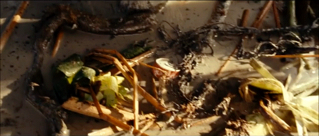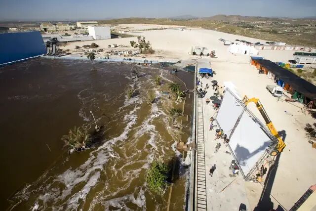 制片组每天要运送135吨的水到蓄水池中,并且用特制的机器手臂上下搅拌水池里的水,让水保持浑浊和翻滚的状态。