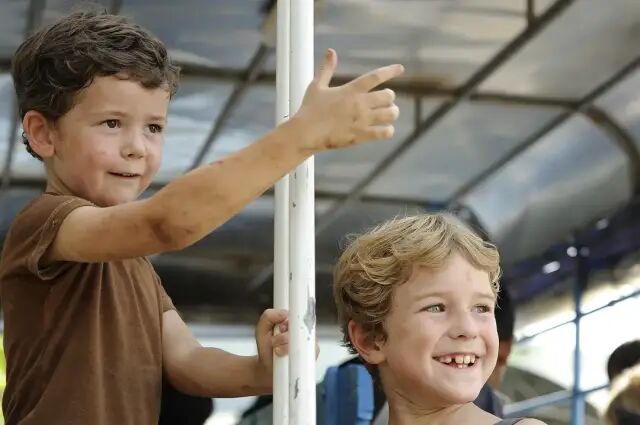 五岁的小萌娃西蒙和七岁的托马斯奔跑着拥入哥哥的怀里。