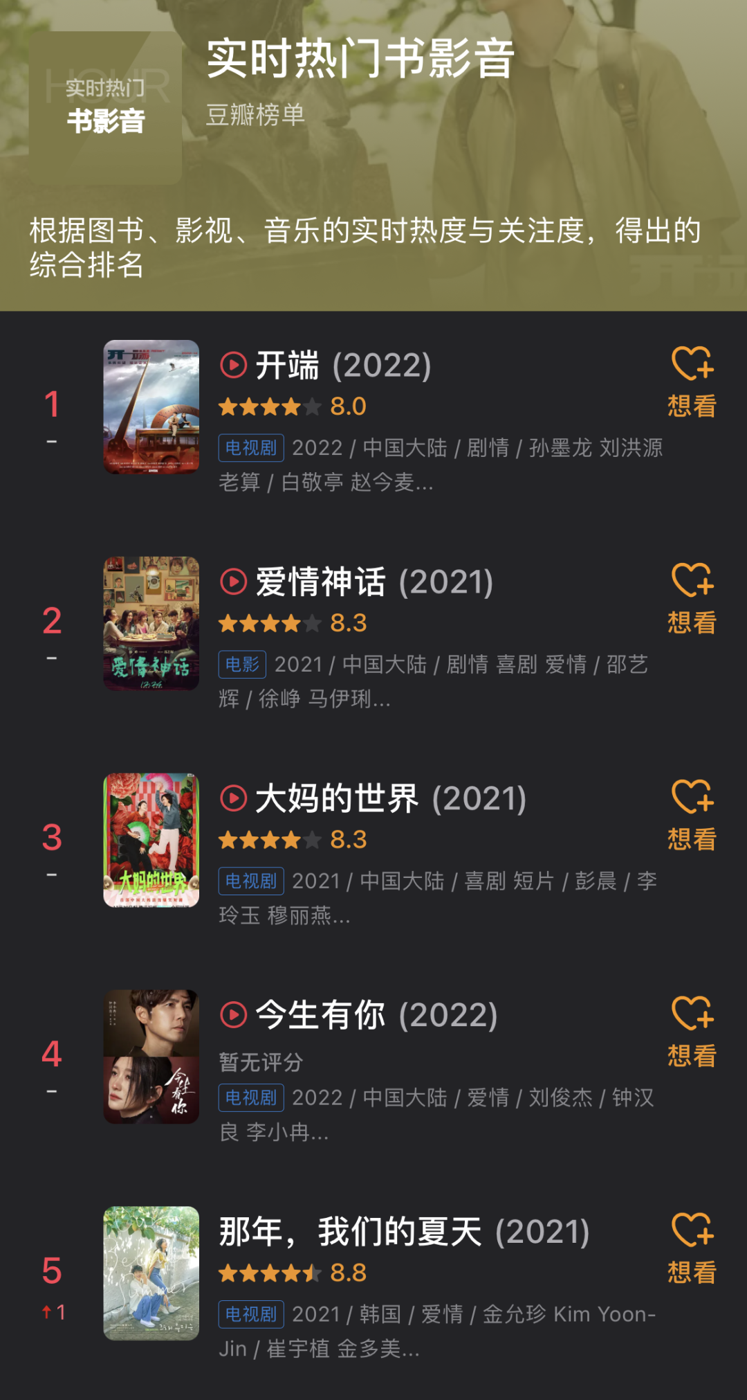 还是排在实时热门书影音榜首的豆瓣,数据统计显示,这就是2022年初最火的网剧。
