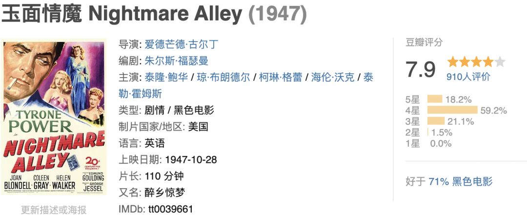 1947年的《玉面情魔》,被形容为「好莱坞最尖刻无情的黑色电影」,主要描写社会的阴暗面。