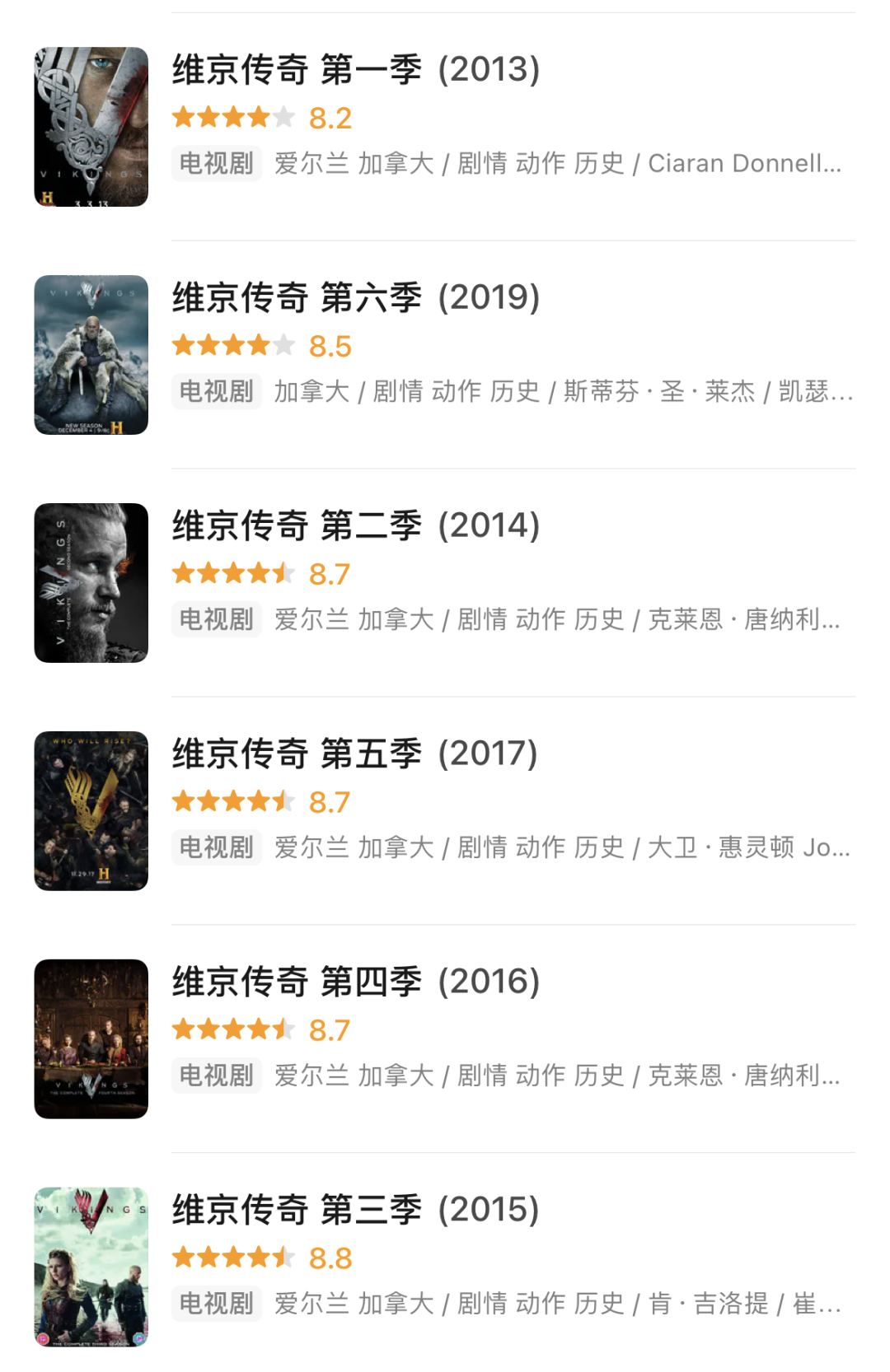 《维京传奇:英灵神殿》改编自迈克尔·赫斯特创作的《维京传奇》,于2013年首播,到19年共六季,该剧的评分和口碑都不错,好奇维京人鼎盛时期的故事可以选择观看。