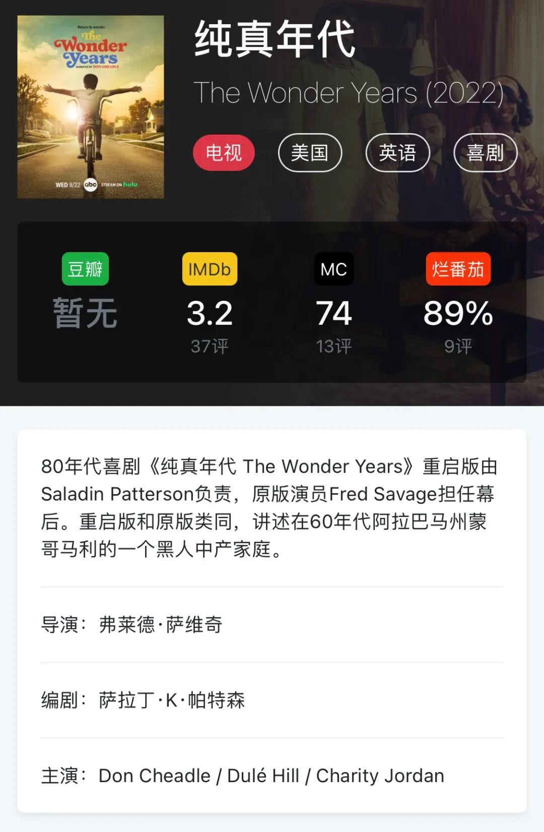 80年代喜剧《纯真年代 The Wonder Years》重启版由Saladin Patterson负责,原版演员Fred Savage担任幕后。重启版和原版类同,讲述在60年代阿拉巴马州蒙哥马利的一个黑人中产家庭。