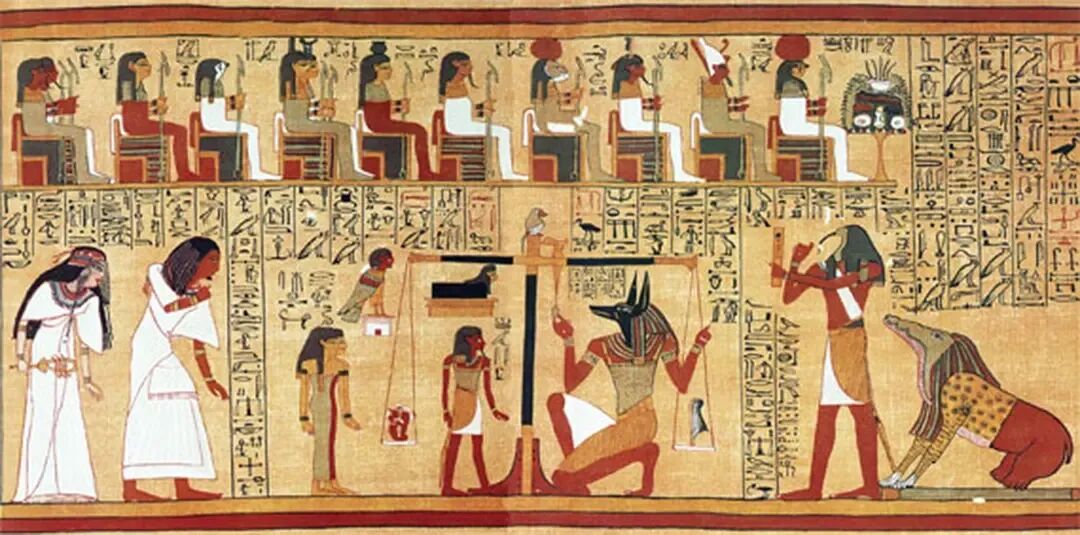 去世的阿尼的心脏被放在天平上,与正义女神玛亚特翅膀上的一根羽毛比较。