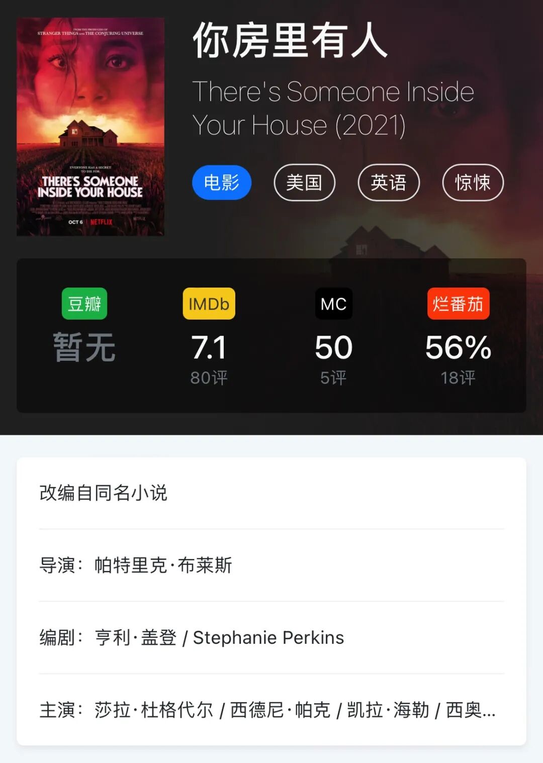 由温子仁及《怪奇物语》制作人肖恩·利维监制的恐怖片《你房里有人》(There's Someone Inside Your House)今日上线网飞,改编自同名小说。