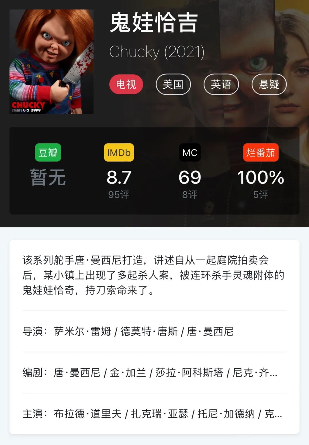恐怖电影鬼娃系列剧集版《鬼娃恰吉》开播,由该系列舵手唐·曼西尼打造,讲述自从一起庭院拍卖会后,某小镇上出现了多起杀人案,被连环杀手灵魂附体的鬼娃娃恰奇,持刀索命来了。