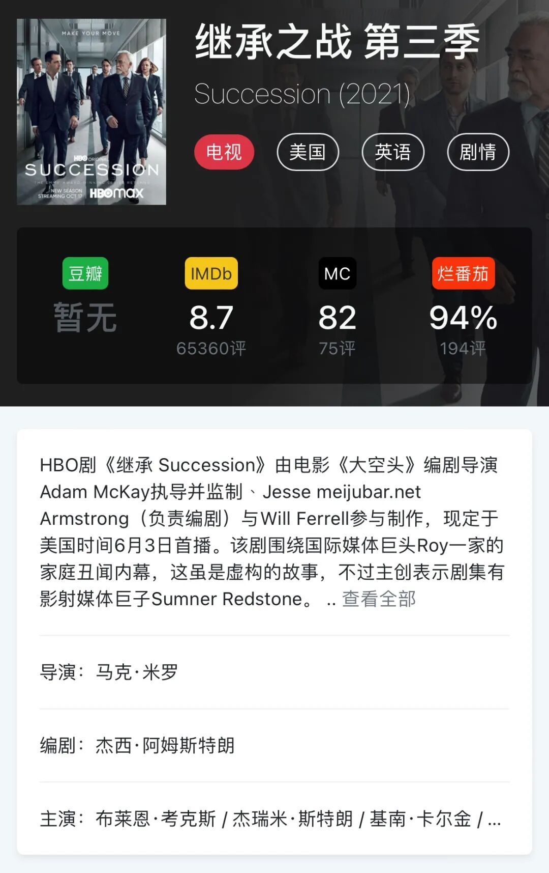 《权力的游戏》之后HBO的最受好评的剧集就是这部《继承之战》(Succession)了,讲述为了继承家业家族内讧撕逼的故事,仿佛看到兰尼斯特、坦格利安或小指头来到现代世界互相撕逼。该剧IMDb均分8.7分,豆瓣前两季评分8.3和9.3,MC均分82,三季评分分别为70、89和91,一季比一季走高,该剧第二季也包揽了金球和艾美的最佳剧集和最佳男主角,艾美的最佳女主、最佳导演和最佳编剧,可以说也是现象级剧集了。