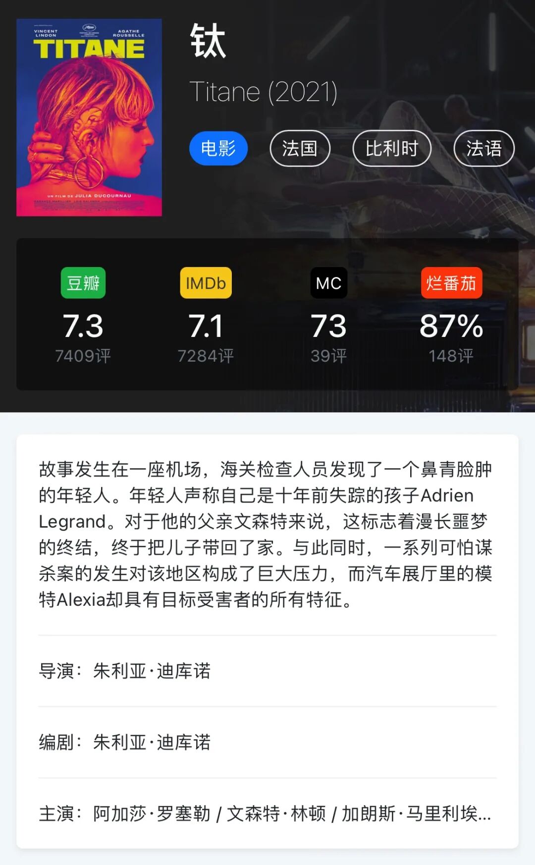 《钛》是一部由编剧兼导演朱莉娅·杜库诺执导的迷幻、性别转换、色情和暴力恐怖的胜利之作。