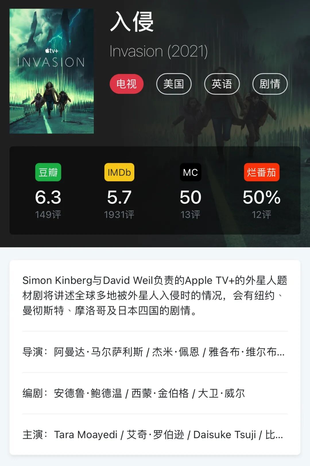 Apple tv+上周推出了这部由《火星救援》(The Martian)制作人Simon Kinberg打造的新剧《入侵》 (Invasion),从介绍上来看主题是外星人入侵地球,上线后评价非常凄凉,根据这个介绍和制作人绝大部分人希望看到的可能是类似《殖民地》(Colony)或者《陨落星辰》(Falling Skies)这样的地球人反抗外星人的剧集,可实际上更像M·奈特·沙马兰版的作品,普通人类生活被无法解释的力量改变。