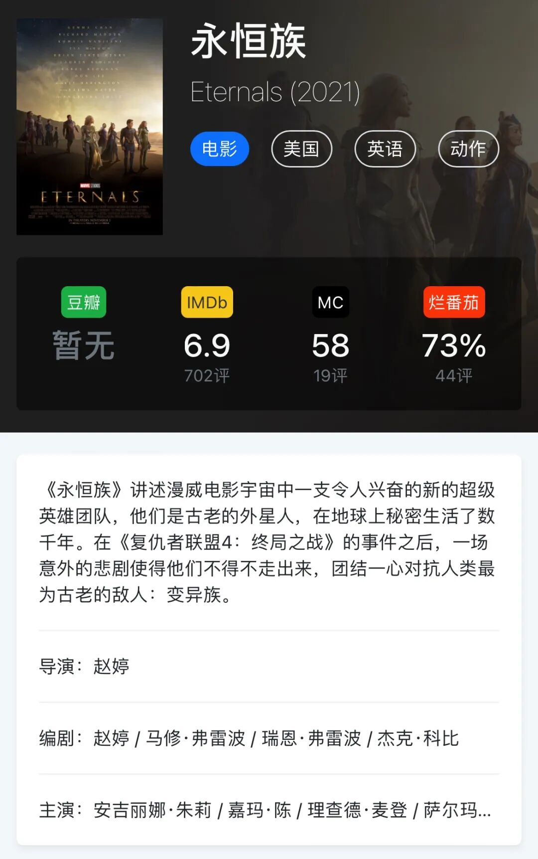 漫威电影宇宙MCU的第26部电影,由中国导演赵婷执导的《永恒族》媒体开分,目前MC总共19评58分,烂番茄44好评率73%。对比上一部漫威电影《尚气与十环传奇》(Shang-Chi and the Legend of the Ten Rings)71分,漫威系列最低分《雷神之锤2》(Thor: The Dark World)54分,大概可以了解这部电影在美国媒体的位置。