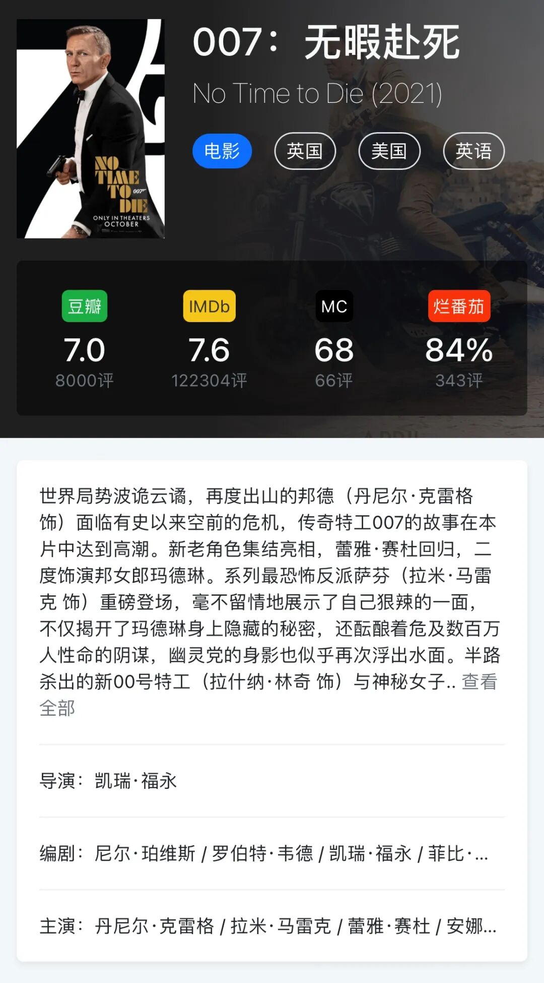 尽管无暇赴死分数不算很高,也算平均水平,如果是克雷格粉,就去电影院欣赏克雷格最后一次饰演的007吧。