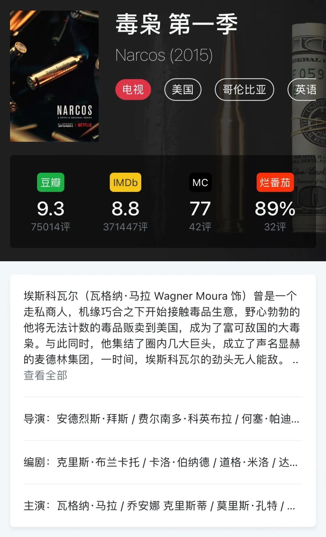 第 2 季 Netflix出品的传记剧《毒枭》(Narcos)讲述了毒枭巴勃罗·埃斯科瓦尔(Pablo Escobar)和将他绳之以法的执法人员的故事,第二季比第一季有了明显改善。