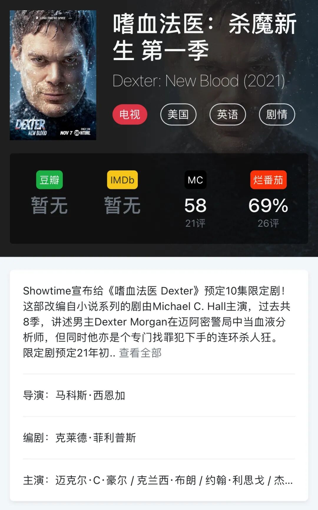 《嗜血法医 Dexter》改编自小说系列,由Michael C. Hall主演,过去共8季,讲述男主Dexter Morgan在迈阿密警局中当血液分析师,但同时他亦是个专门找罪犯下手的连环杀人狂。限定续集中主演Michael C. Hall及制作人Clyde Phillips皆会回归,故事发生在德克斯特·摩根(Dexter Morgan)在飓风劳拉中失踪10年后,现在化名住在纽约州北部的铁湖(Iron Lake),远离他在迈阿密的老家。