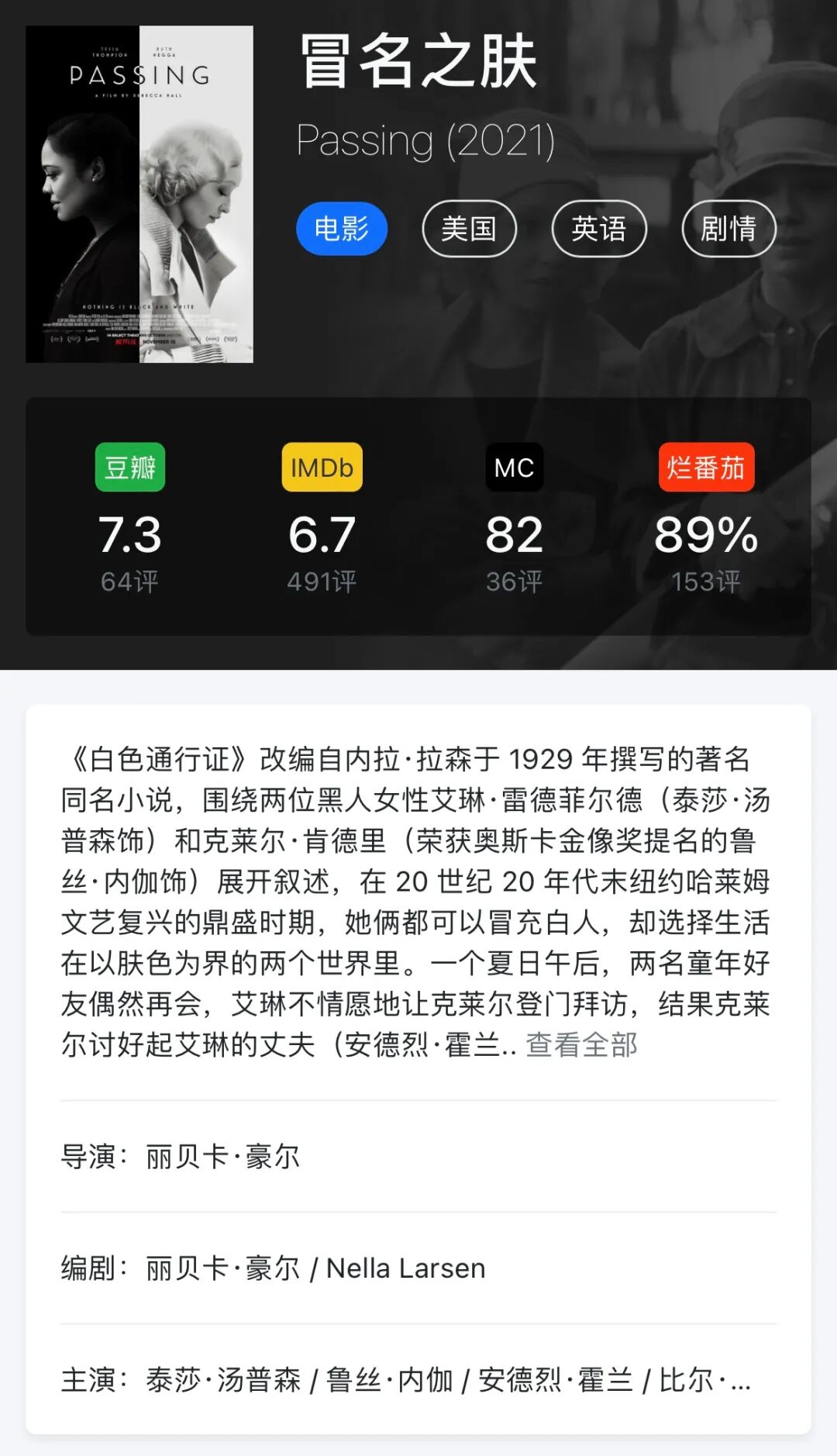 《冒名之肤》(Passing)改编自内拉·拉森于1929年撰写的著名同名小说,故事发生在20世纪20年代末的纽约,围绕两位黑人女性艾琳·雷德菲尔德(泰莎·汤普森饰)和克莱尔·肯德里(荣获奥斯卡金像奖提名的鲁丝·内伽饰)展开,讲述两个不同生活经历的黑人女性的故事。