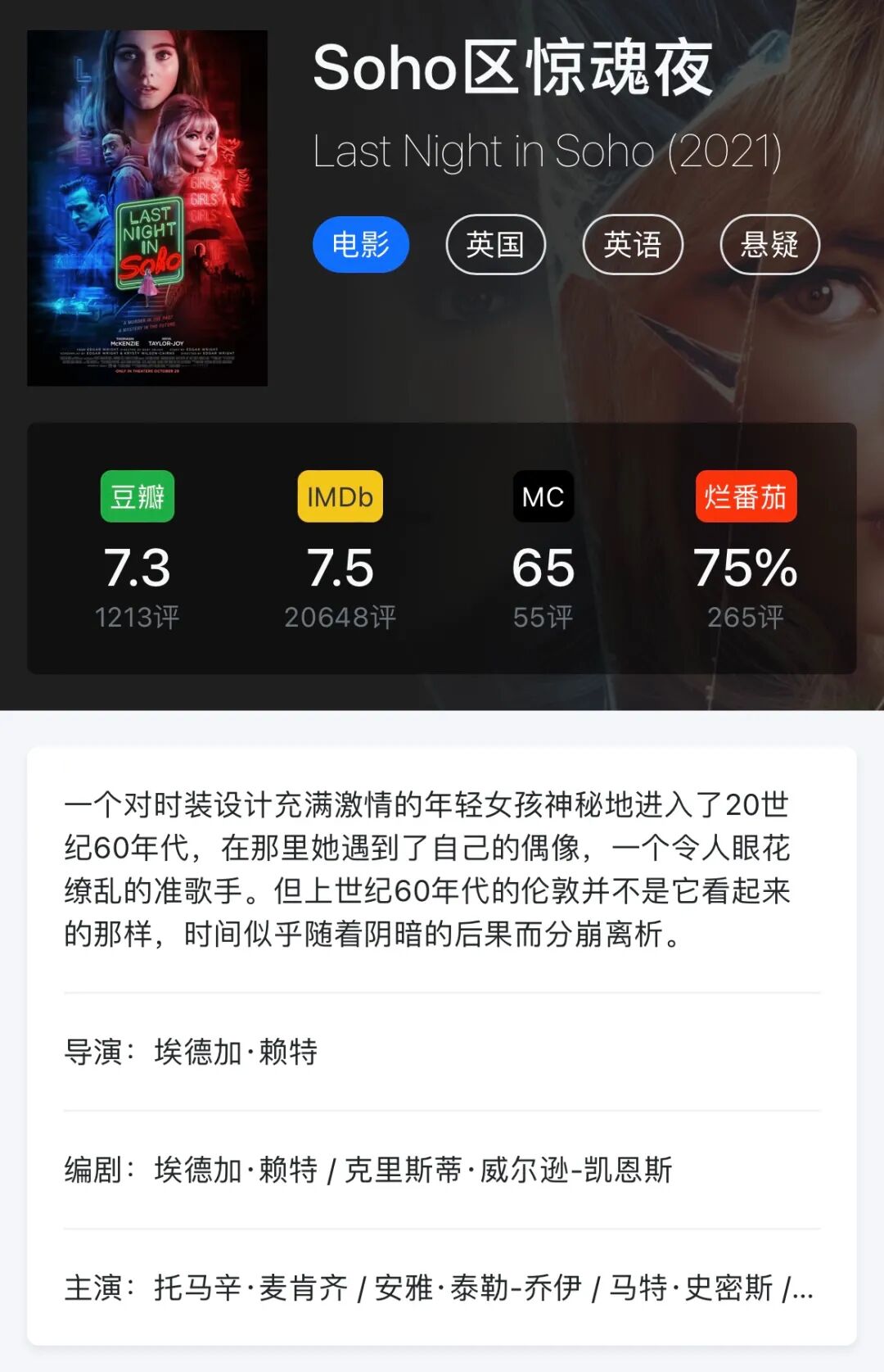 《Soho区惊魂夜》是一部非常令人愉悦的电影,它喜欢玩类型游戏,从时间旅行幻想到黑暗童话,从神秘到噩梦般的恐怖,高潮部分既借鉴了60年代的英国恐怖电影,也借鉴了更现代的迷幻电影。