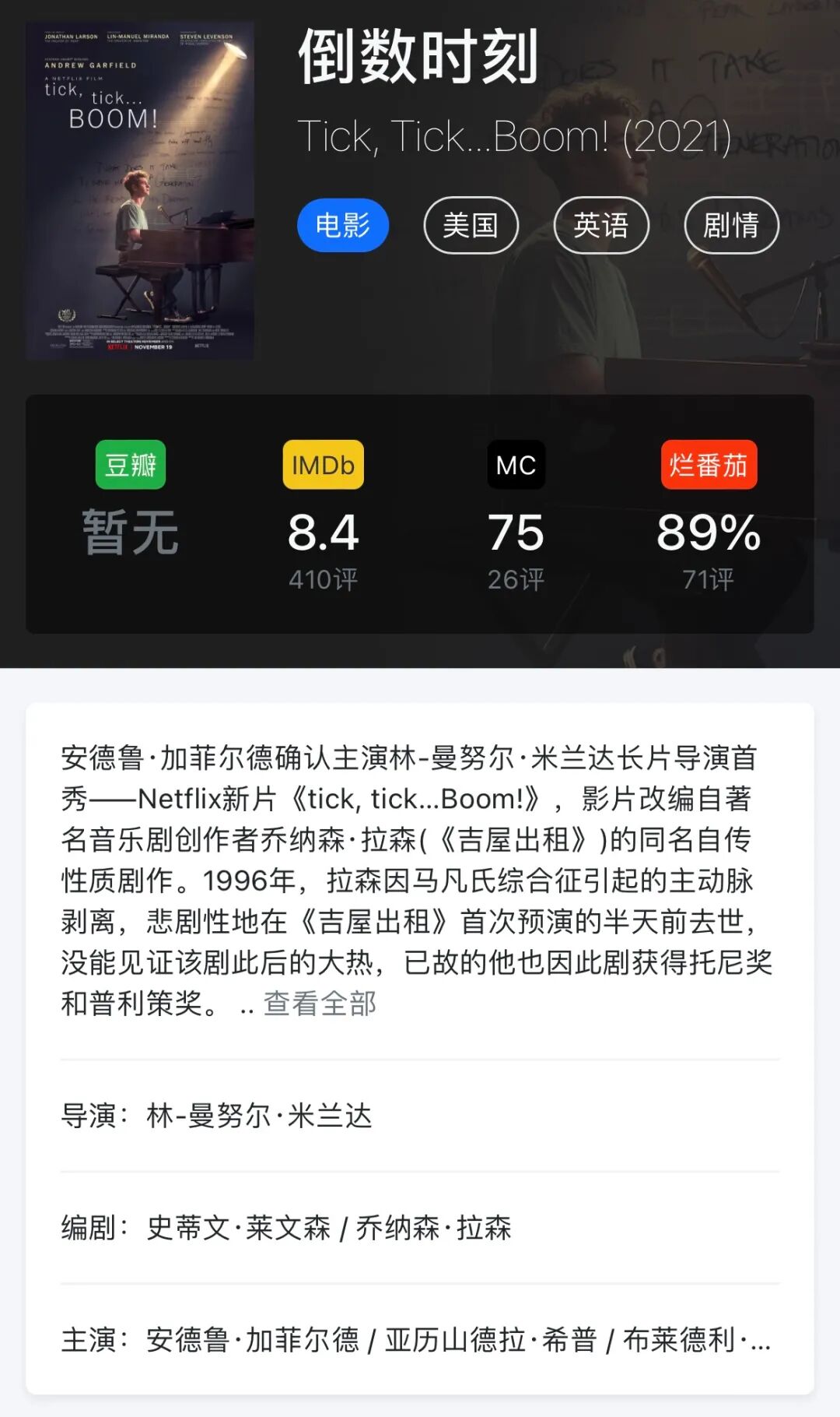 电影《倒数时刻》(Tick, Tick…Boom!)讲述的是这部音乐剧的创造者乔纳森·拉森的故事,在用了几年时间让这部剧可以登上舞台的首演日清晨去世。
