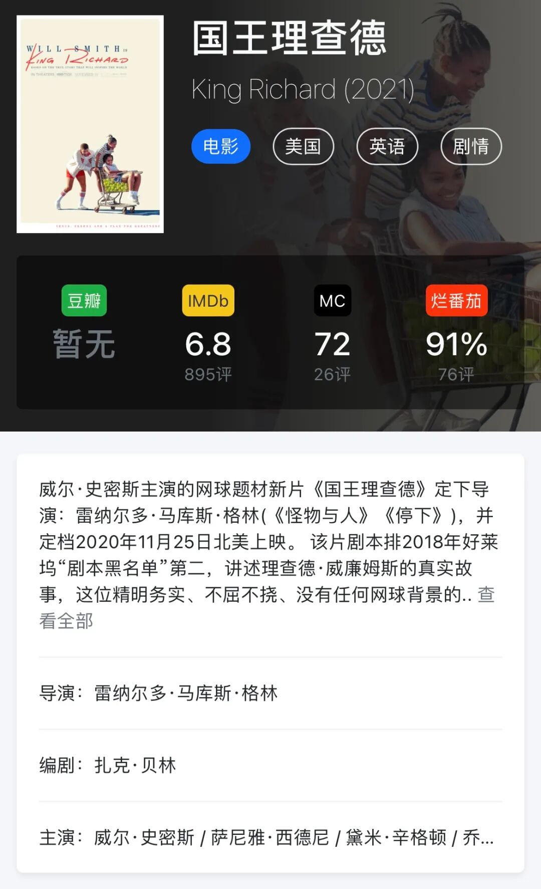 《国王理查德》(King Richard)讲述的是网球巨星维纳斯(大威)和塞雷娜·威廉姆斯(小威)的父亲兼教练理查德·威廉姆斯如何指导女儿们出人头地的故事,继《当幸福来敲门》之后史皇威尔·史密斯再次出演励志老爸的角色。