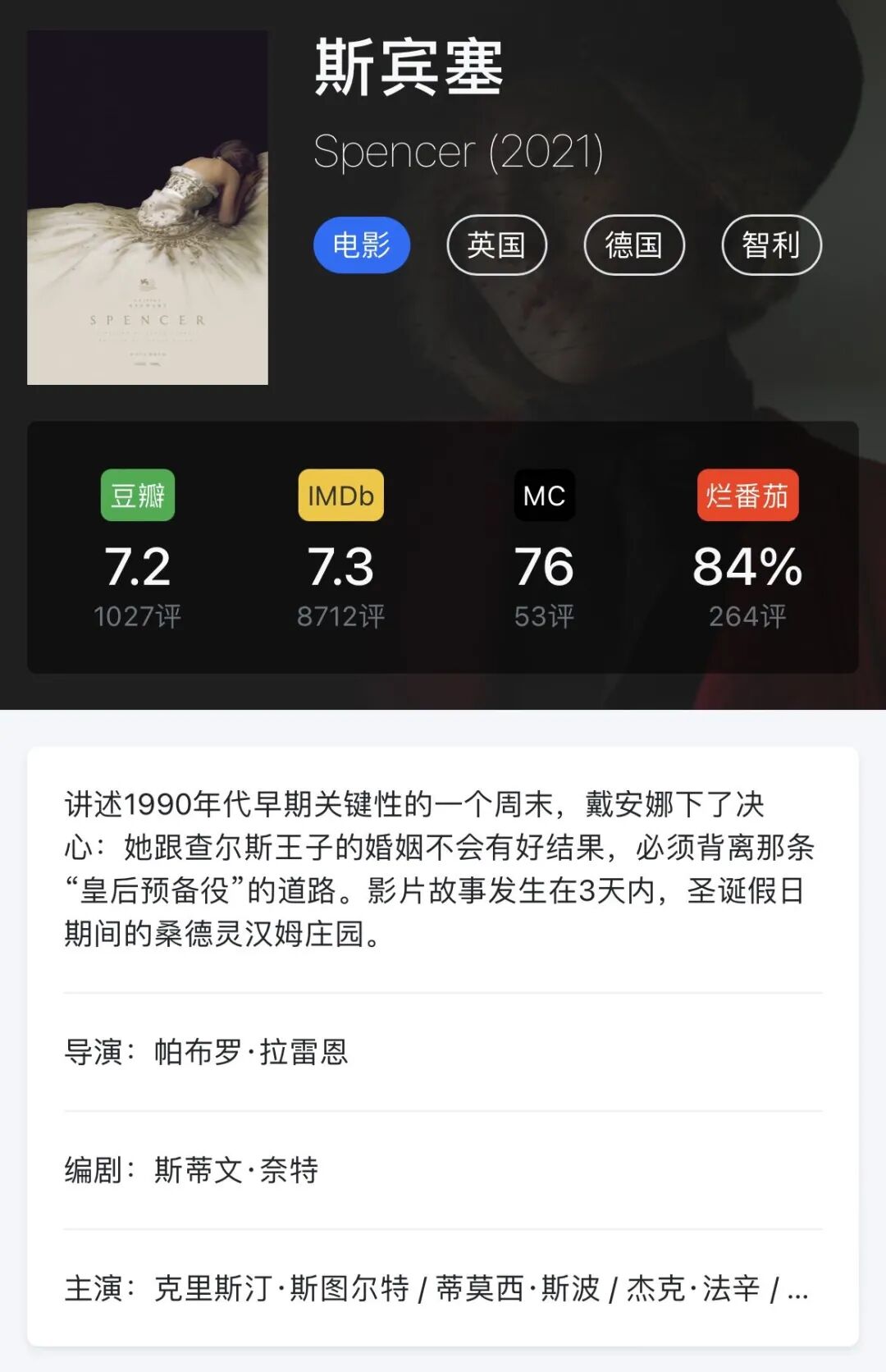 毫无征兆的,今年的奥斯卡热门电影之一《斯宾塞》(Spencer)突然就上线了流媒体,这部电影也是大家熟悉的人物传记题材,而故事背景则是最近今年频受争议的英国皇室。