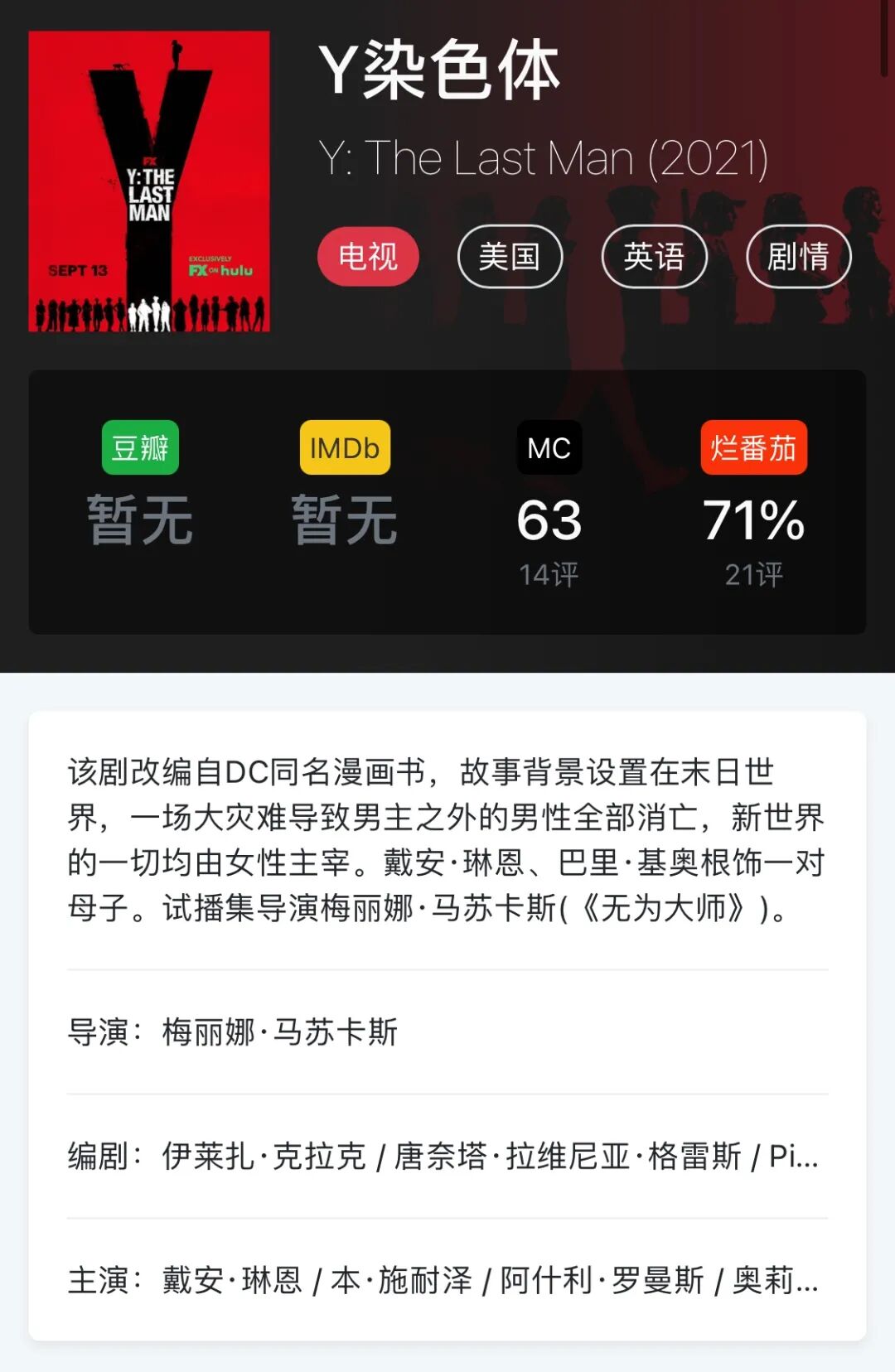 该剧改编自DC同名漫画书,故事背景设置在末日世界,一场大灾难导致男主之外的男性全部消亡,新世界的一切均由女性主宰。戴安·琳恩、巴里·基奥根饰一对母子。试播集导演梅丽娜·马苏卡斯(《无为大师》)。