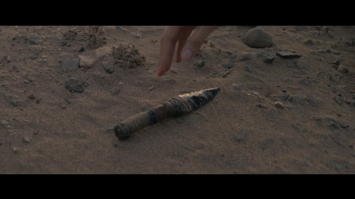 打退变异族以后,瑟希将一把石头匕首变成铜匕首,递给当地土著。