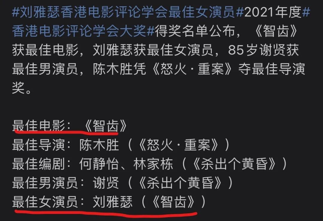 也同时斩获了今年香港电影评论学会的最佳电影和最佳女演员奖