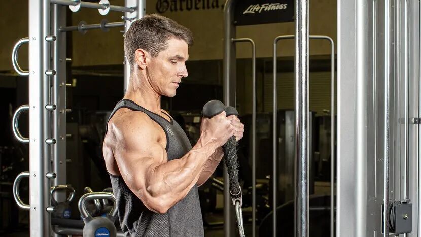 对握的哑铃锤式弯举很棒,但绳索的锤式弯举更值得推荐,因为训练的全程都会给予我们的肱肌持续的张力。