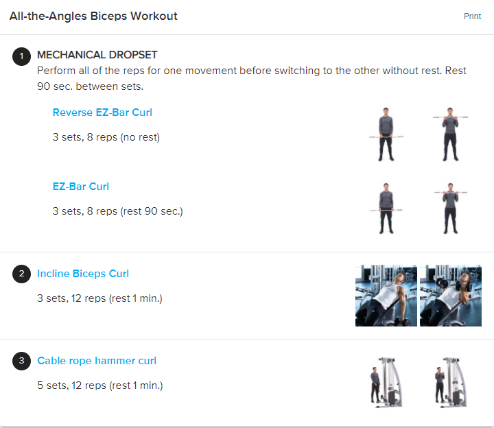 更好的方式:给大家安排一套训练计划。训练计划中包含了三种不同的握法:掌心朝上,掌心朝下,掌心相对。还包含了不同的角度,大臂位于体前,大臂位于体后以及大臂位于体侧。你可以练到肱二头肌长头,也可以练到短头,包括前臂。如果你是用金字塔原则慢慢增加重量,然后做到力竭为止,可能需要20-30分钟。