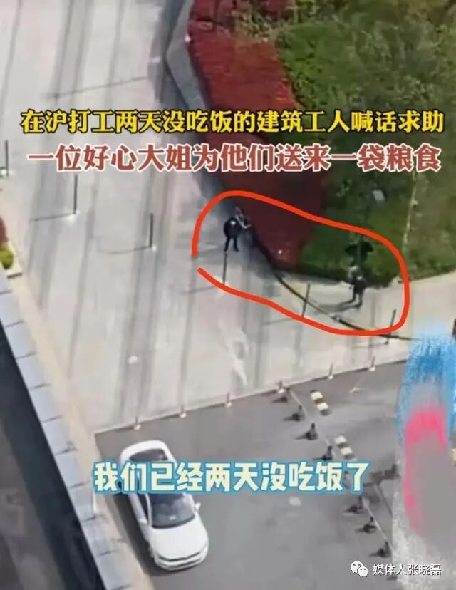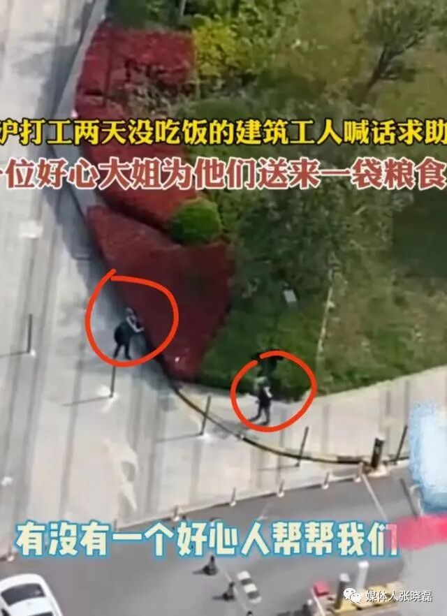 可是,就在这时,一位大姐突然搬着一袋沉甸甸的粮食出现在了两个工人的眼前!大姐气喘吁吁地说:“给,这些吃的给你们,你们带回去先吃....”简单的一句话,瞬间暖到两个工人的心里!看到大姐的举动,再听到大姐说的话,两个工人感动坏了,一直连声对大姐说感谢,感谢她的雪中送炭,感谢她的“救命之恩”!这位大姐明明自己都过得不尽人意,可还是见不到人间疾苦!在现在这个关键时期,能拿出那么一大袋的食物给别人,说明这大姐是个大善人!她和工人素不相识,但她没想过给了以后,自己家会不会缺粮,只想着向工人施以援手,这种善举令人动容!而一个打工人能喊出这句话,可能这是他头一回!堂堂七尺男人,如果不是因为疫情的原因,是不会张这个嘴的。如果不是实在饿得受不了,他们肯定不会愿意舍下面子这样做!“那句帮帮我们打工的....”真的很令人心疼,他们又是谁的父亲,谁的儿子,谁的丈夫呢?一个无奈的求助,一个感人的善举,当他们碰撞在一起,就变成了温暖感人的好事!出门在外都有不易的时候,不求打工人在外能吃好,只求他们不饿肚子,感谢大姐施于援手!如果每个人都能出一份力,那就是人间大爱!其实,在上海也有很多和大姐一样的好心人,我们要相信上海是一座有温度的城市!愿疫情早日过去,春暖花开!