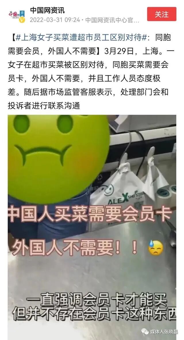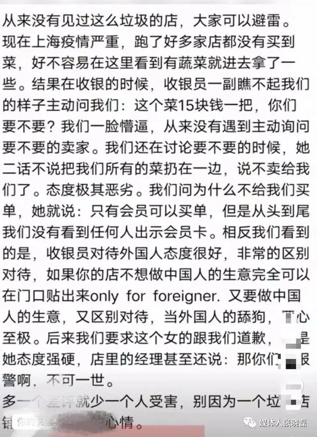 可让女子气愤的是,从头至尾也未看到有人出示会员卡,相反看到对待外国人尤其客气,非常区别的对待!后来要求这个收银员道歉,可是态度强硬拒不道歉,店里经理还说可以报警,并指责女子影响他们经营。随后女子向相关部门对该超市进行了投诉。同胞买菜需要会员卡,外国人不需要,并且工作人员态度极差。随后据市场监管客服表示,处理部门会和投诉者进行联系沟通…处理部门会和投诉者沟通?而不是去处理商家?让人不解!对此有网友评论说:在上海这种事太正常了,有些人的膝盖还是软的啊!!!对此事大家怎么看?欢迎留言评论!