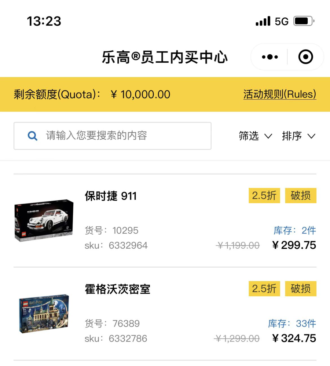 内买分为2.5折和5折,2.5折非常划算,且件数很少,所以竞争的激烈程度堪比高考。比如下图的保时捷911,只有2件,全公司,还有嘉兴工厂的同事们都瞄准了它,基本就是进去就秒没。